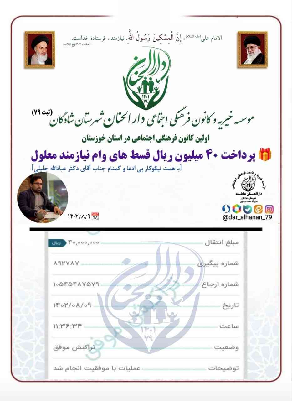 از زحمات و همت برادر عزیز جناب آقای عبادالله جلیلی در پرداخت قسط های وام نیازمند معلول به مبلغ ۴۰ میلیون ریال، تشکر و قدردانی مینماییم.